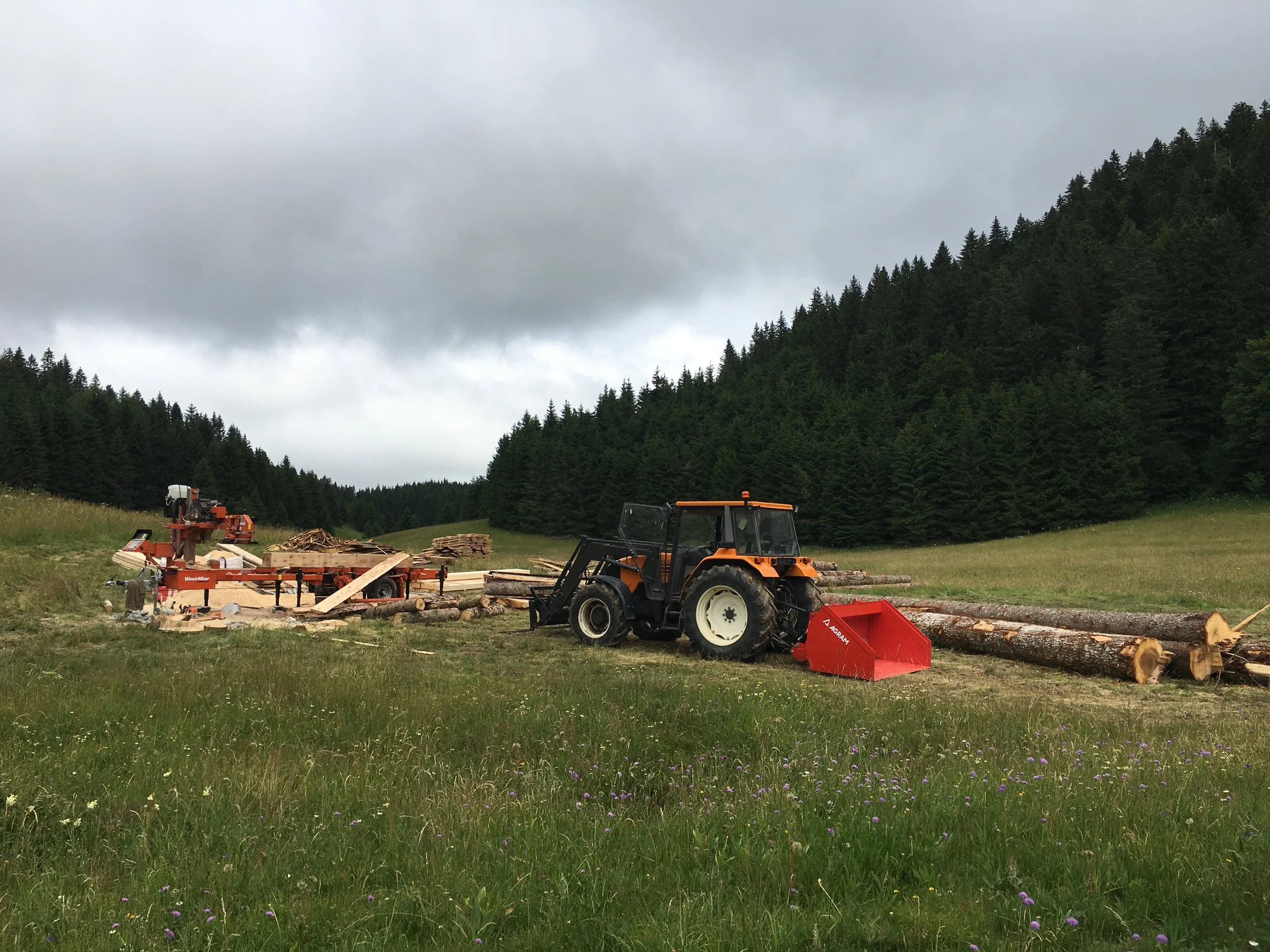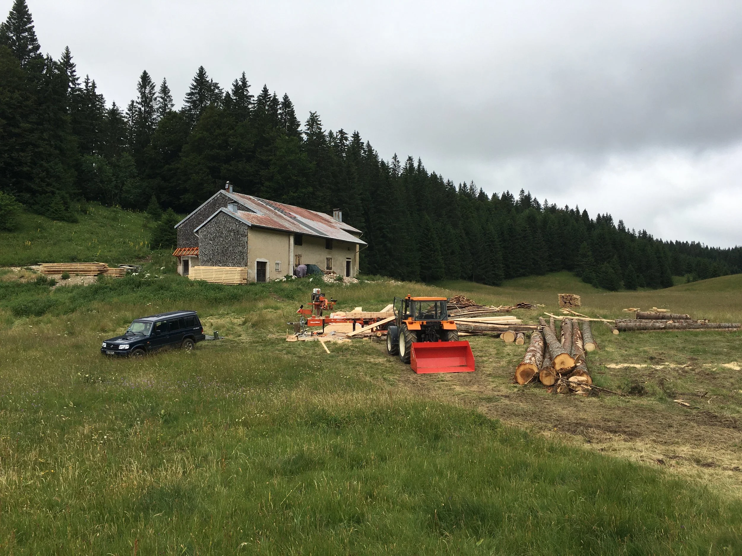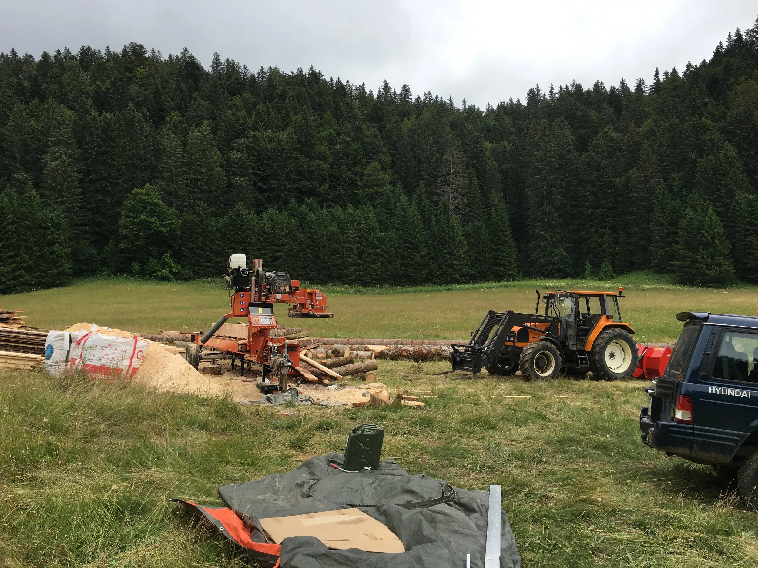 Sciage d’arbres issus de bois local directement en forêt, pour la création de planches et de poutres sur mesure. Chaque élément a été travaillé avec soin afin de construire un couvert en bois alliant robustesse, esthétisme et intégration harmonieuse à son environnement.